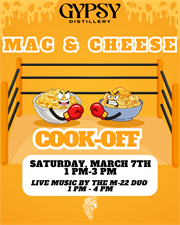 Join us on March 7th from 1–3 PM for a cheesy showdown at Gypsy Distillery! Sample a variety of creative mac & cheese recipes, enjoy live music by the M-22 Duo, and celebrate local culinary talent.
