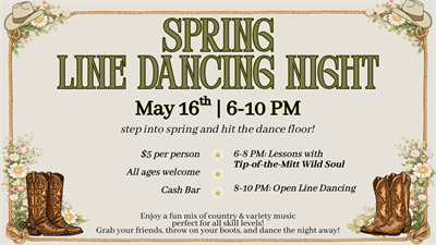 Lessons (6–8 PM): Led by Tip-of-the-Mitt Wild Soul, these guided lessons will walk you through the steps with a mix of music and easy-to-follow instruction. Whether you’re brand new or just brushing up, it’s a great way to get comfortable and learn a variety of line dances in a welcoming environment.